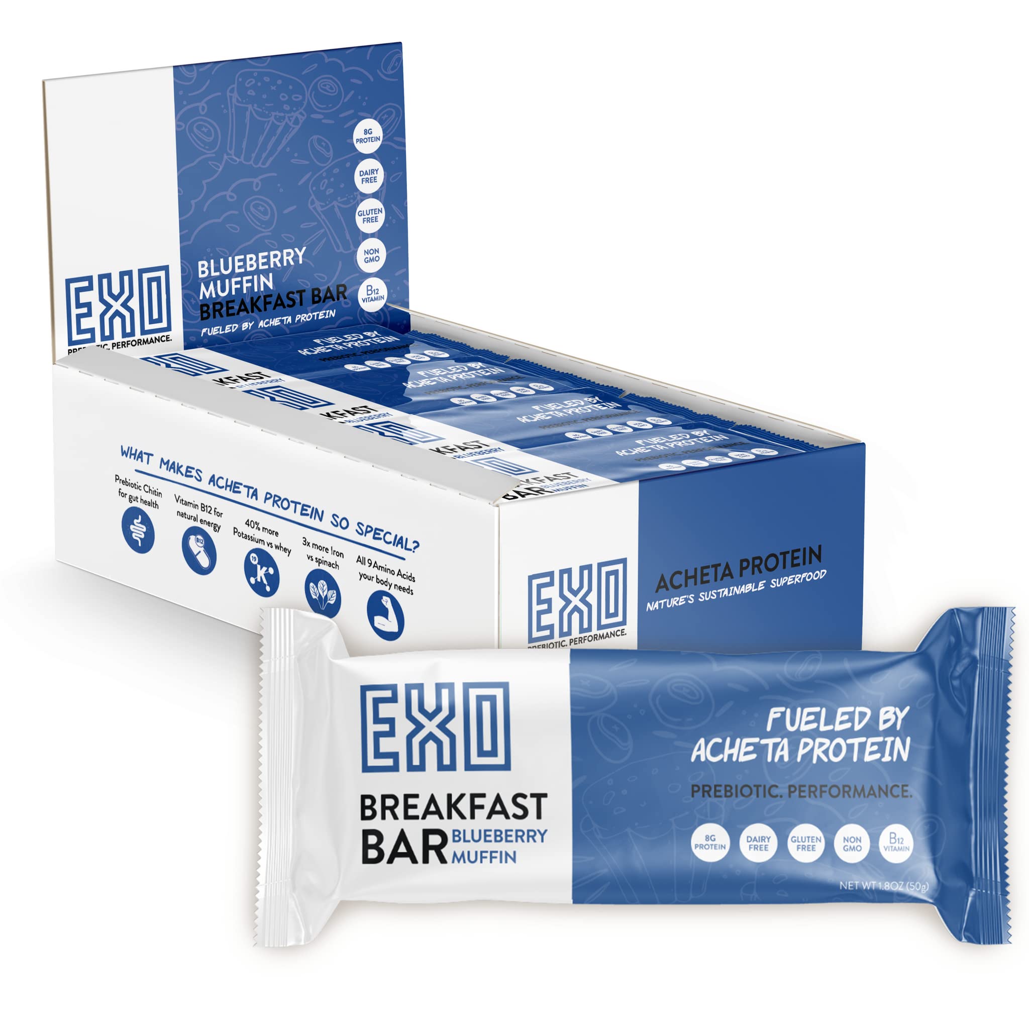 Amazon Com Exo Prebiotic Breakfast Bars Blueberry Muffin 12 Count Real Fruit No Added Sugar 8g Protein Vitamin B12 Gut Heath Sustainable Gluten Free Dairy Free Non Gmo All Natural Vegetarian Paleo